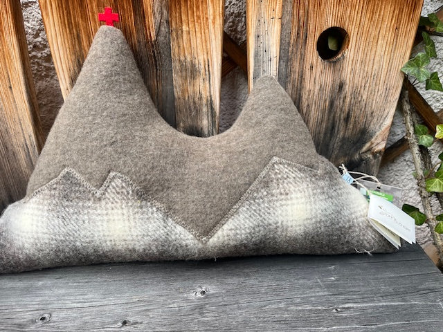 Jedes Kissen ist ein Einzelstück und variiert leicht. Dieses Kissen hat als Grundstoff einen Karowollstoff. Die Gipfel sind aus Merinowolle. Das schneidige Gipfelkreuz ist mit der Hand aus Wollfilz ausgeschnitten (Farbe Gipfelkreuz kann variieren).